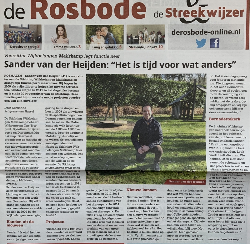 ROSMALEN – Sander van der Heijden (41) is voorzitter van de Stichting Wijkbelangen Maliskamp en draagt zijn functie per 1 maart over. Hij begon in 2009 als vrijwilliger te helpen bij diverse activiteiten. Sander stapte in 2011 in het dagelijks bestuur en is sinds 2014 voorzitter van de Stichting. Deze functie gaat hij nu na vele mooie projecten overdragen aan zijn opvolger.